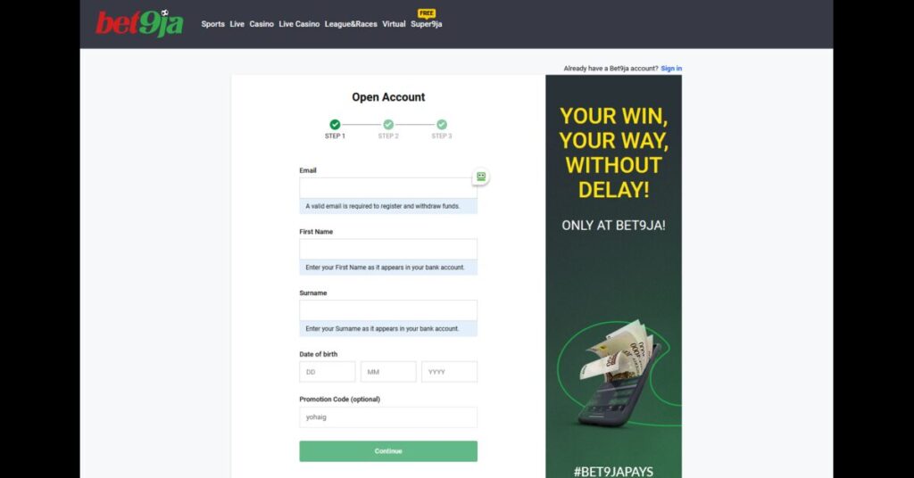The BET 9JA Promotion code during registration 2026 is YOHAIG.